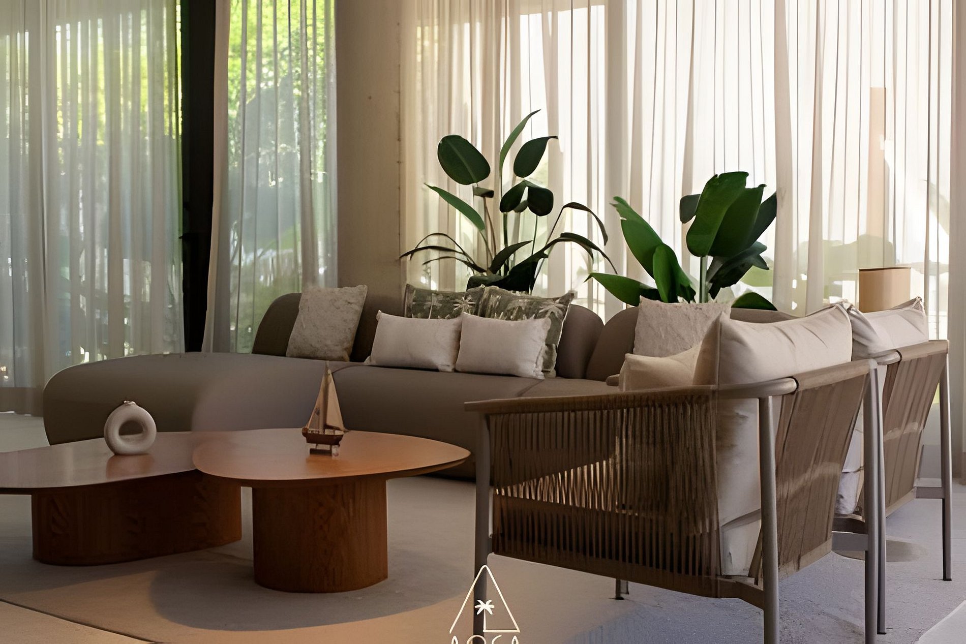 Living room fully integrated with nature, featuring open and fluid spaces.