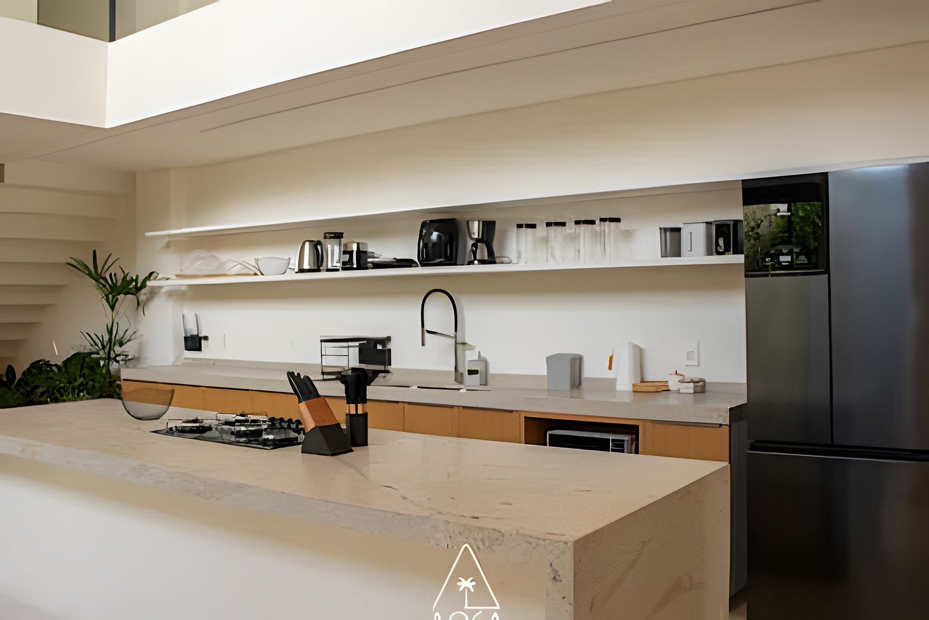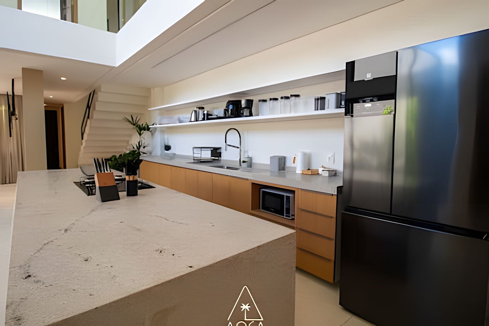Fully equipped gourmet kitchen and a double-height dining area, creating a sophisticated and welcoming atmosphere.