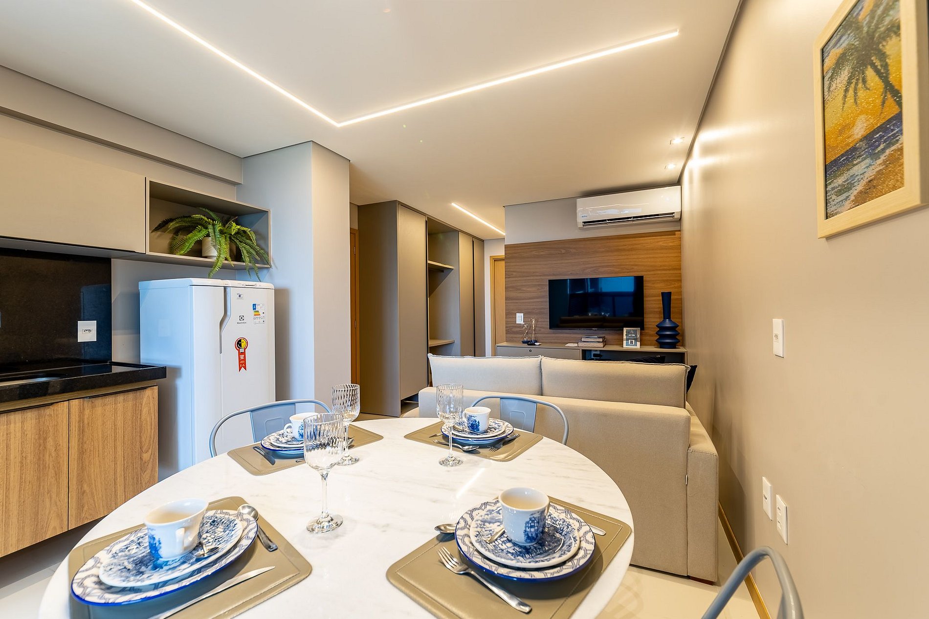 - Living room: Comes with air conditioning, a sofa bed, a TV stand, and a 40'' Smart TV.