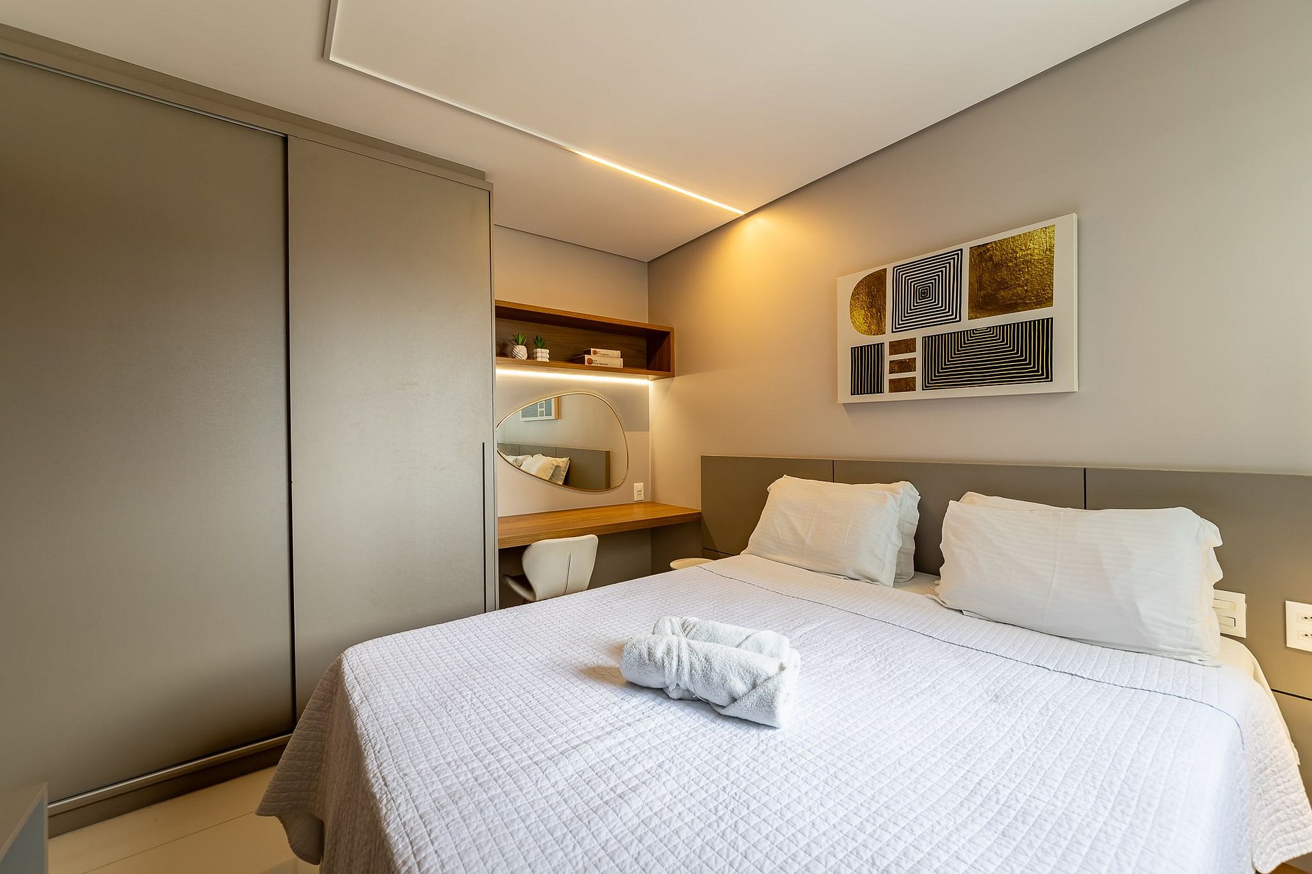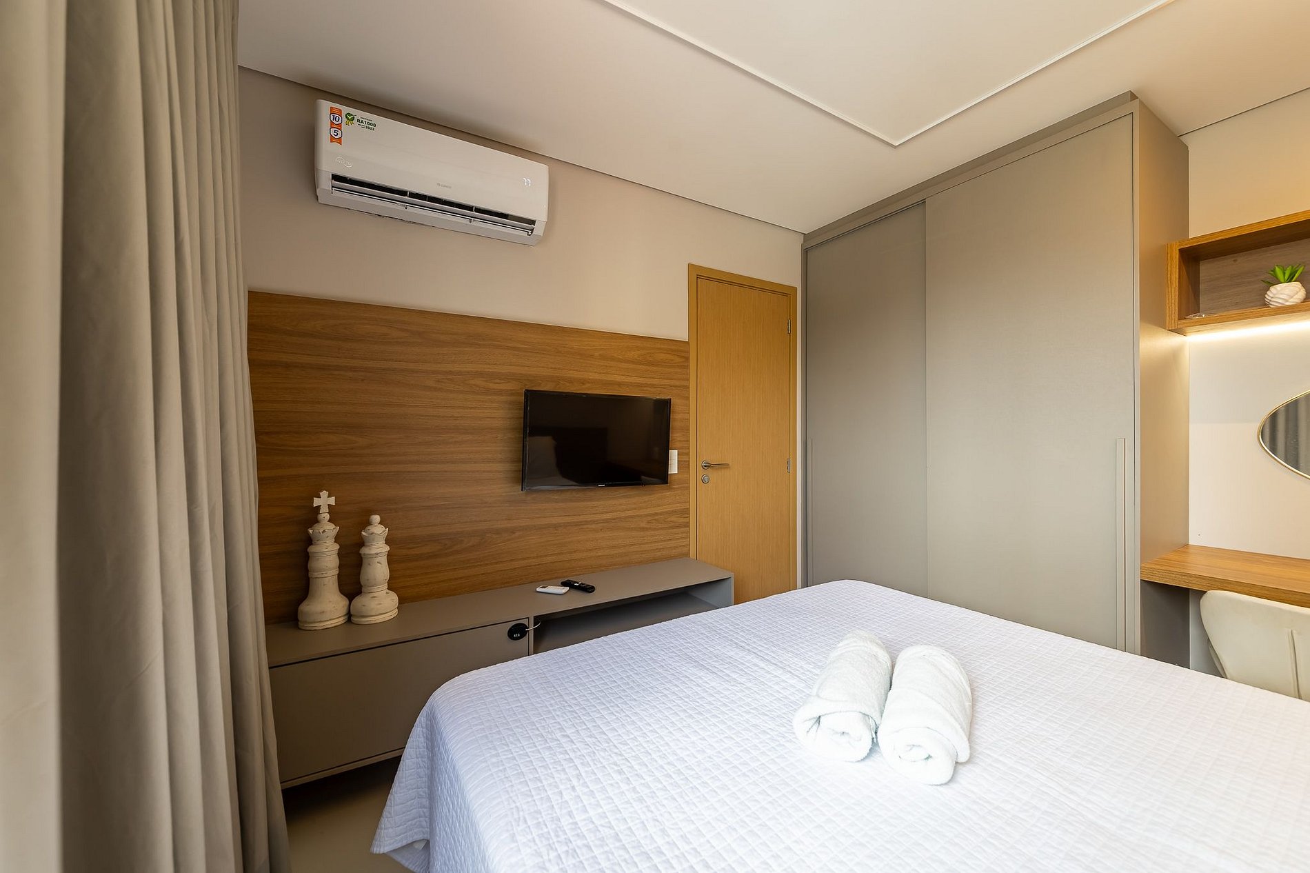 - Bedroom: Features a comfortable bed, Smart TV, air conditioning, and a closet.