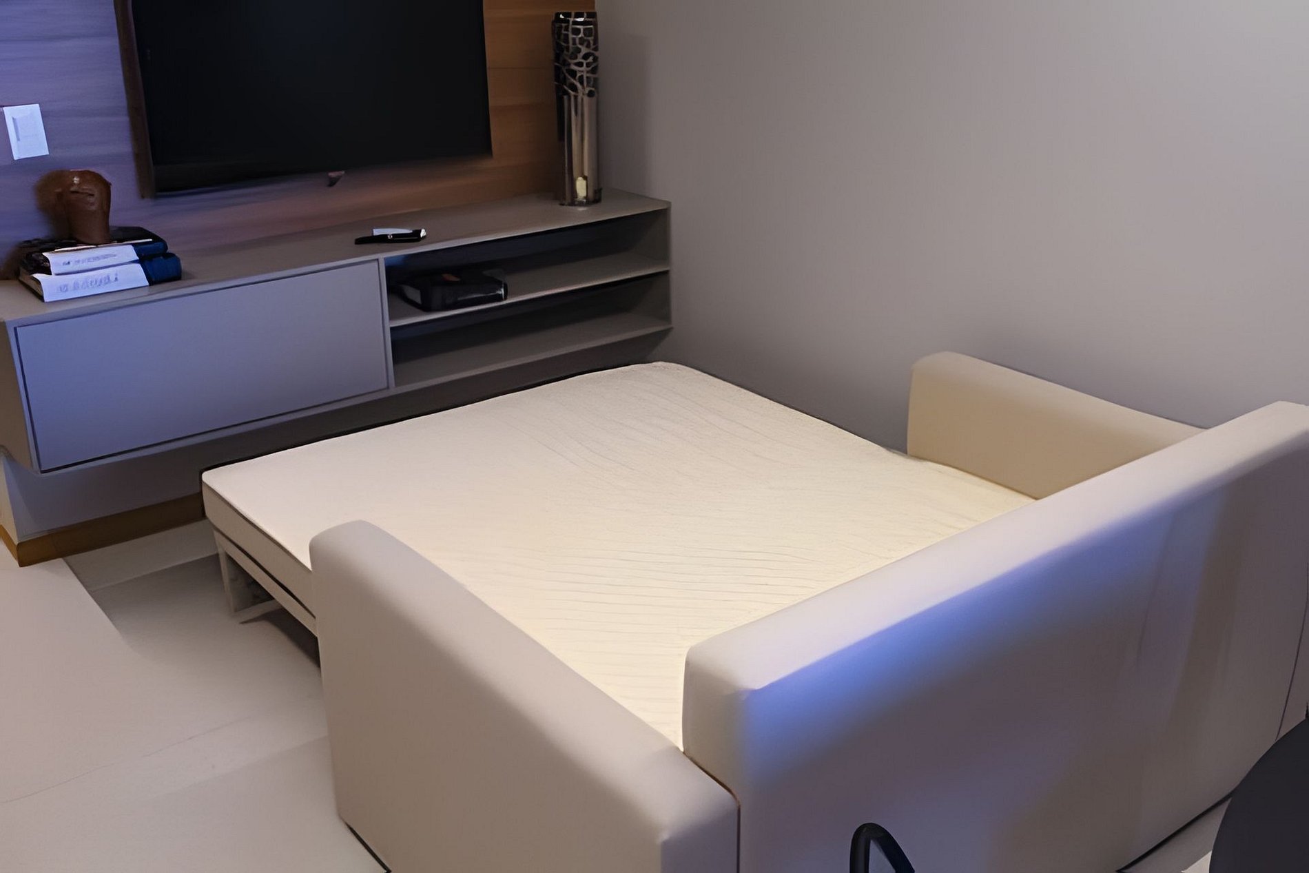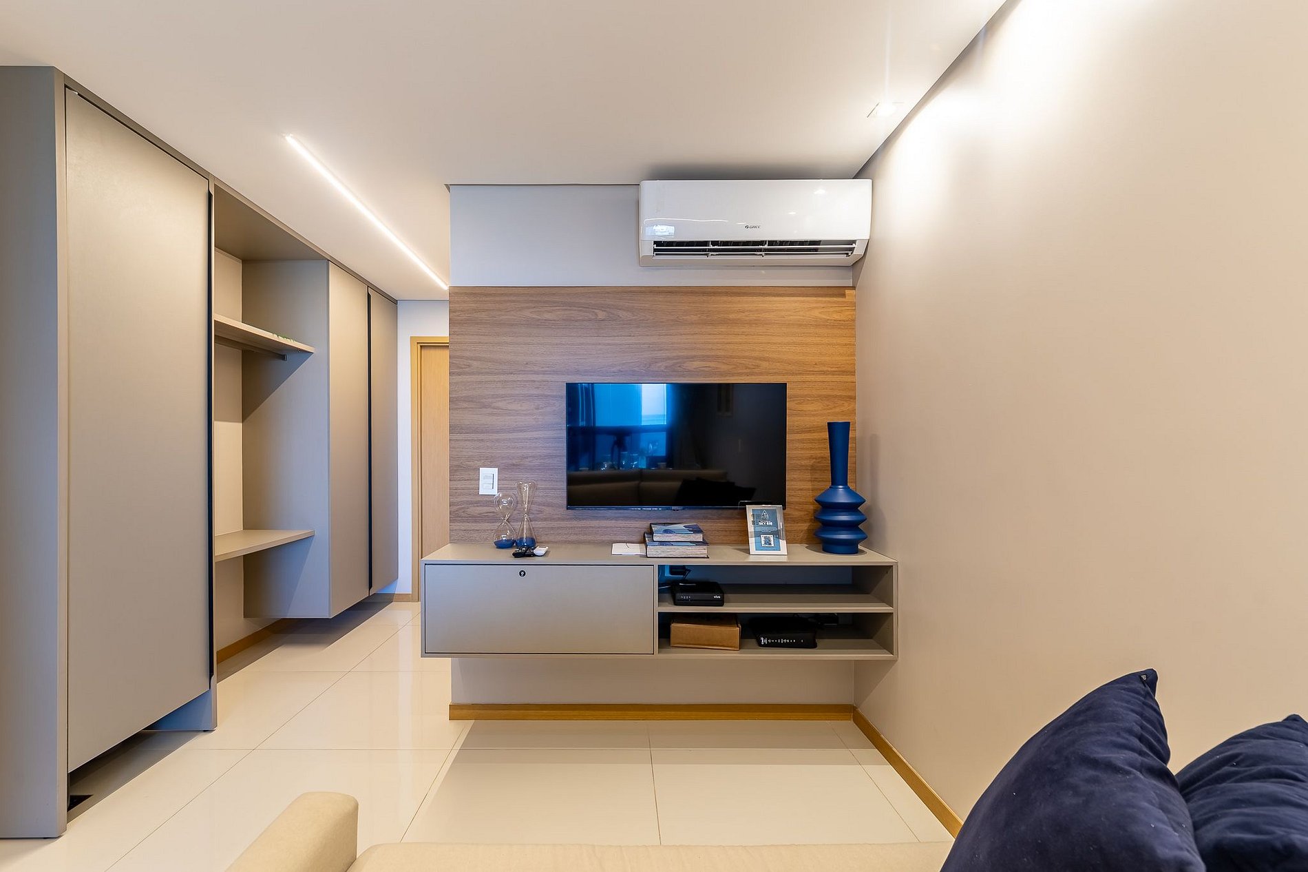 - Living room: Comes with air conditioning, a sofa bed, a TV stand, and a 40'' Smart TV.