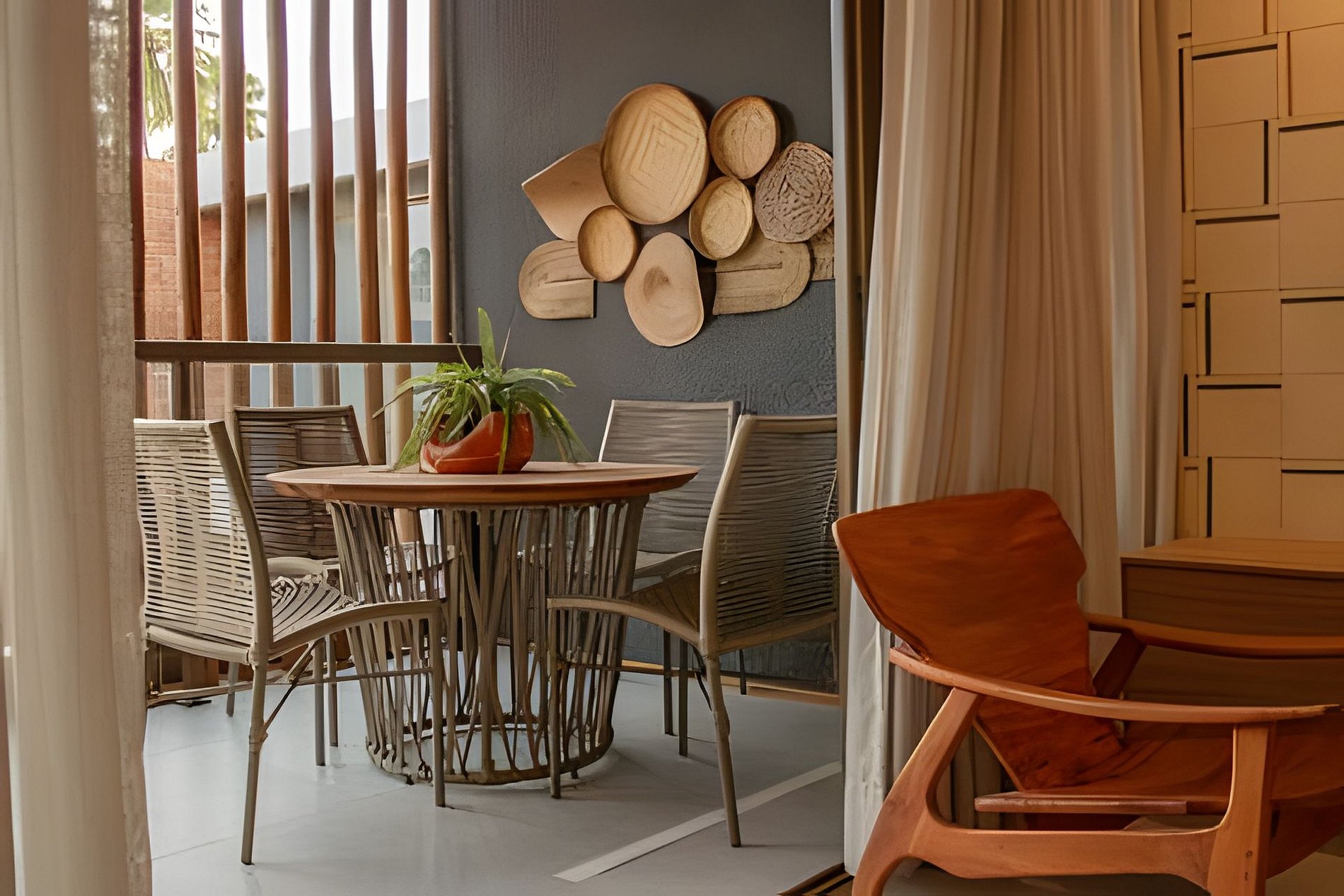 **Privacidade Garantida:** Varanda privativa com vista para o jardim, equipada com mesa para refeições externas e churrasqueira elétrica.