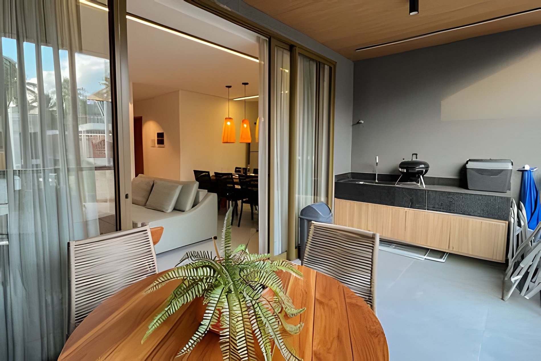 **Privacidade Garantida:** Varanda privativa com vista para o jardim, equipada com mesa para refeições externas e churrasqueira elétrica.