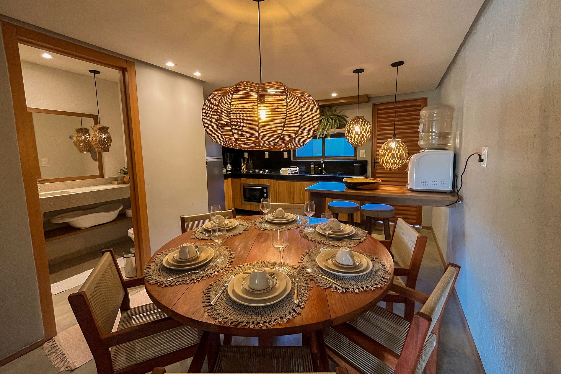 - Duas mesas para refeições, uma interna na cozinha de baixo e outra na área gourmet no rooftop.